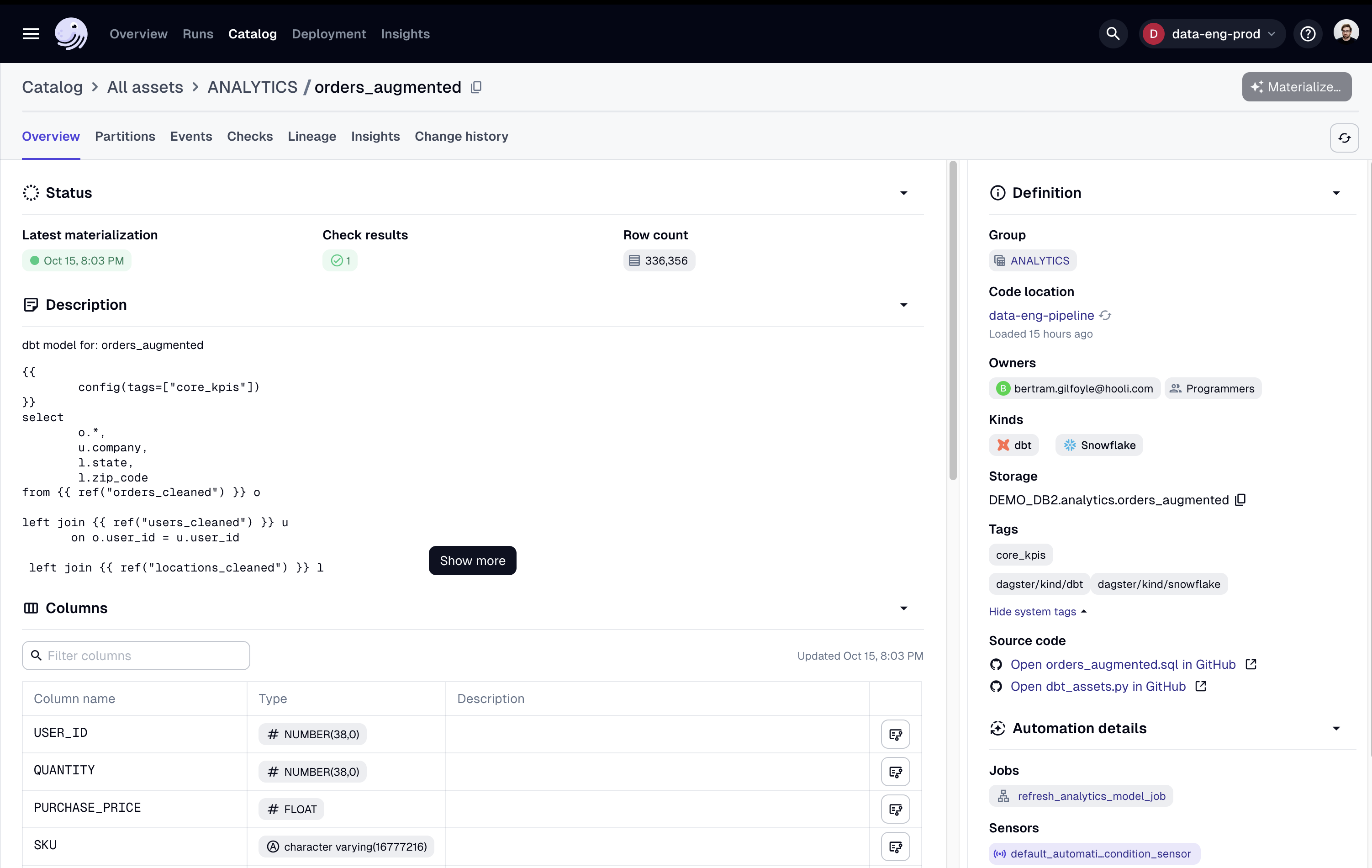 With Dagster+ and your data catalog embedded into your orchestration layer, you get the tools that your data platform teams need to manage data more efficiently and reliably—all in one place.