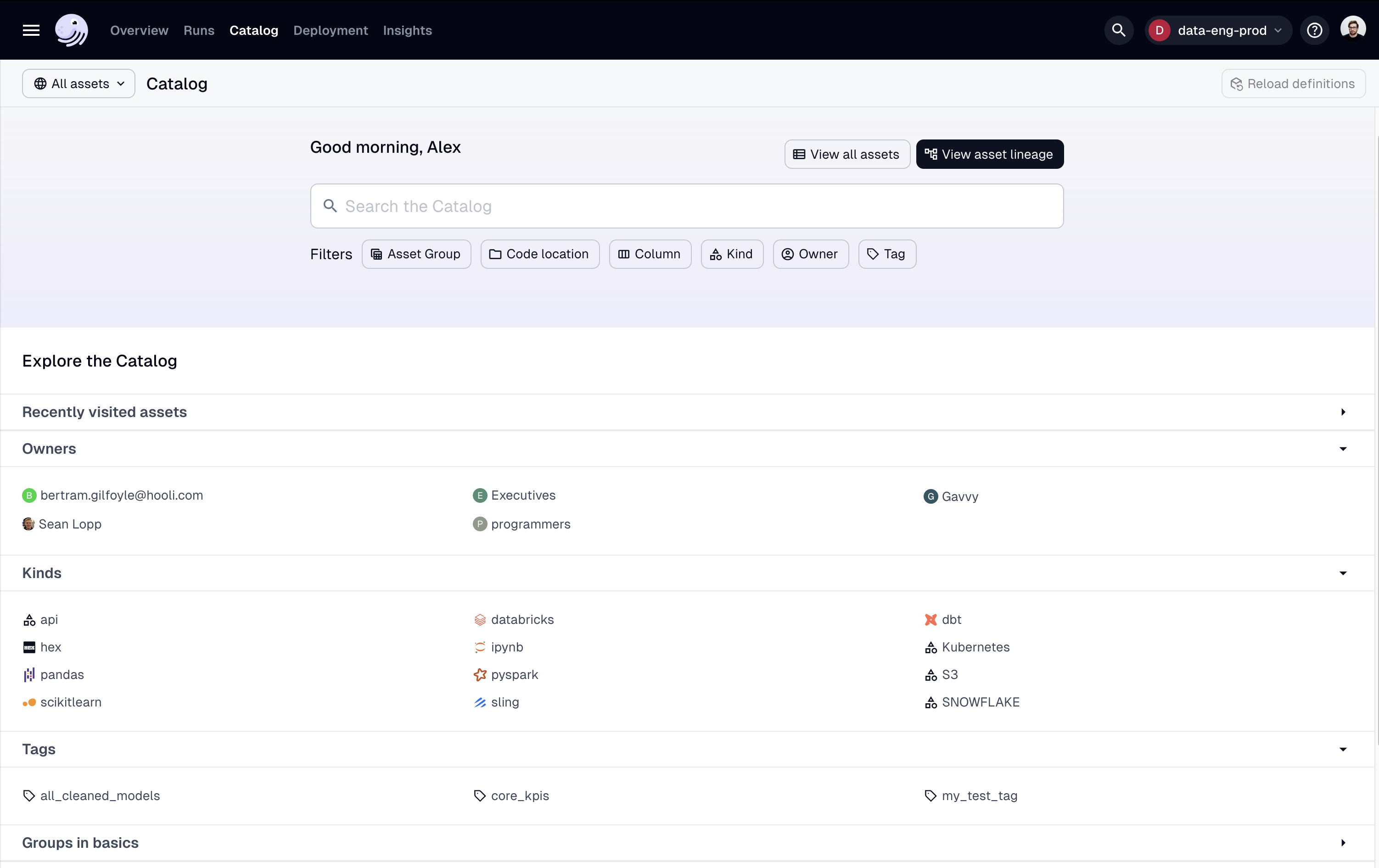 - Holistic view of assets by who owns them, the code location, kind, group, and tags you assign.